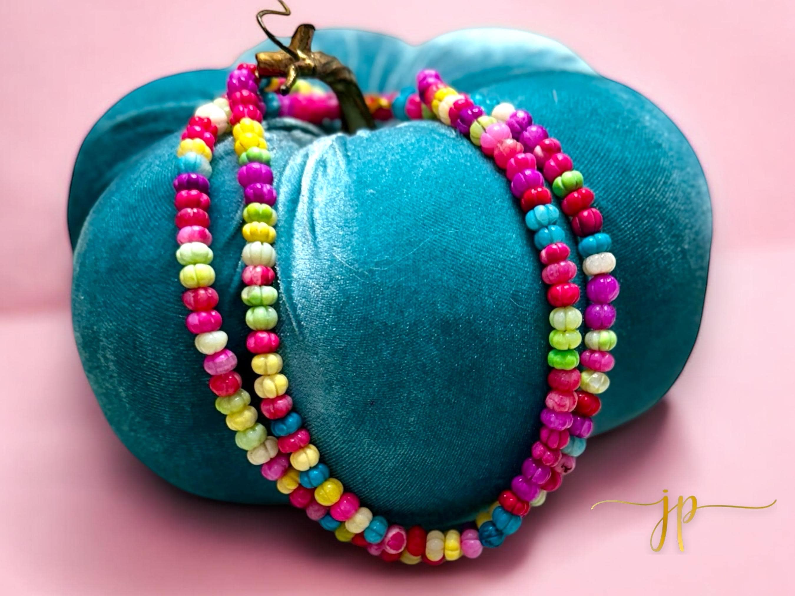 Bring a touch of sweetness to your style with our Jelly Bean Candy Opal Necklace! 🍬✨ This handcrafted piece features vibrant, pumpkin-shaped beads in a delightful mix of colors, inspired by the nostalgic look of the classic jellybean candies. The variety of colors and glossy finish of each bead resemble the irresistible look of a jar full of assorted jelly beans—cheerful, colorful, and a treat for the eyes! Each bead is carefully selected for its unique hue and playful shine, creating a necklace that’s both bold and charming.