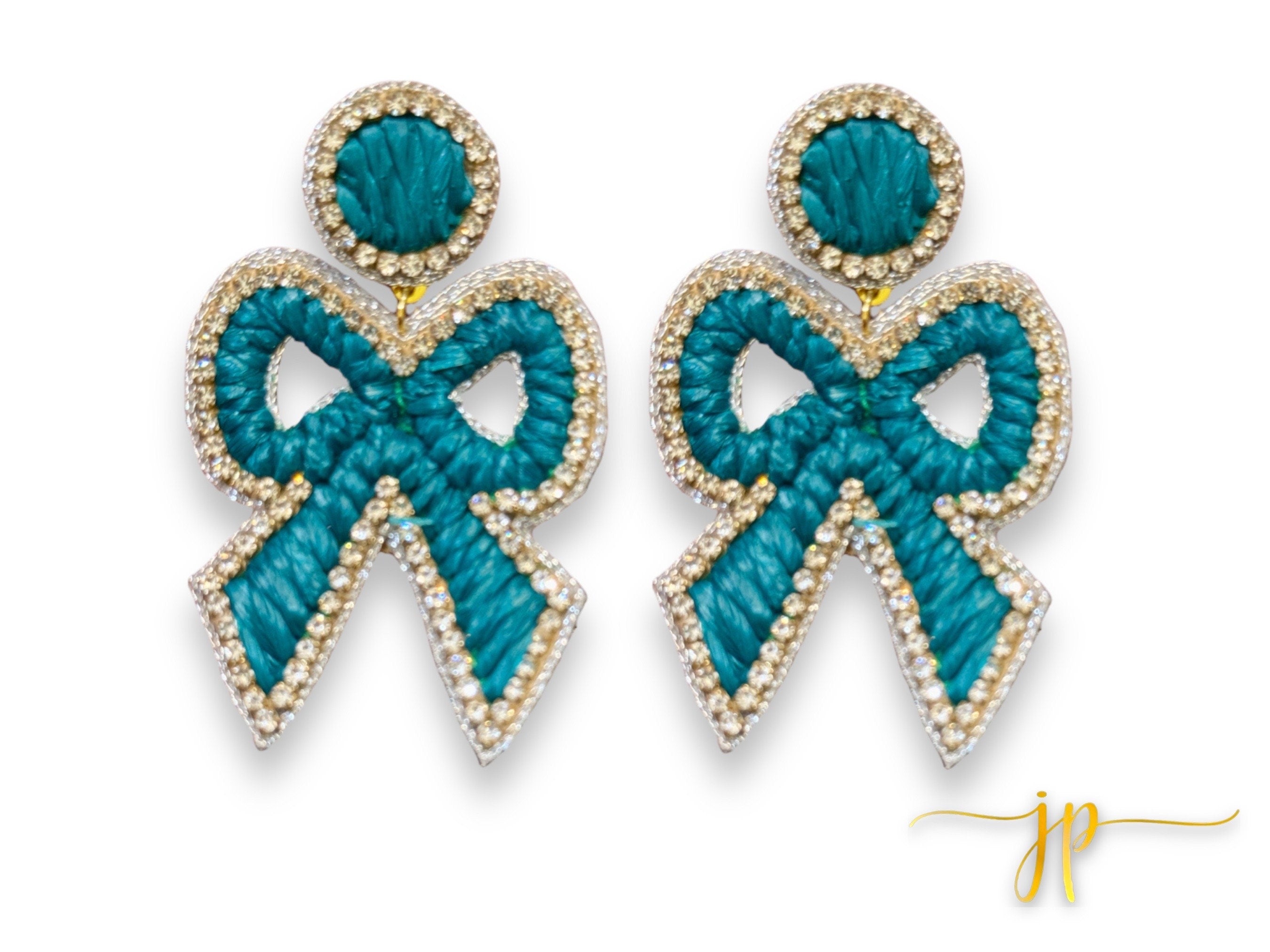 These Elise Dark Green Coquette Raffia Rhinestone Bow handmade earrings are both flirty and charming!