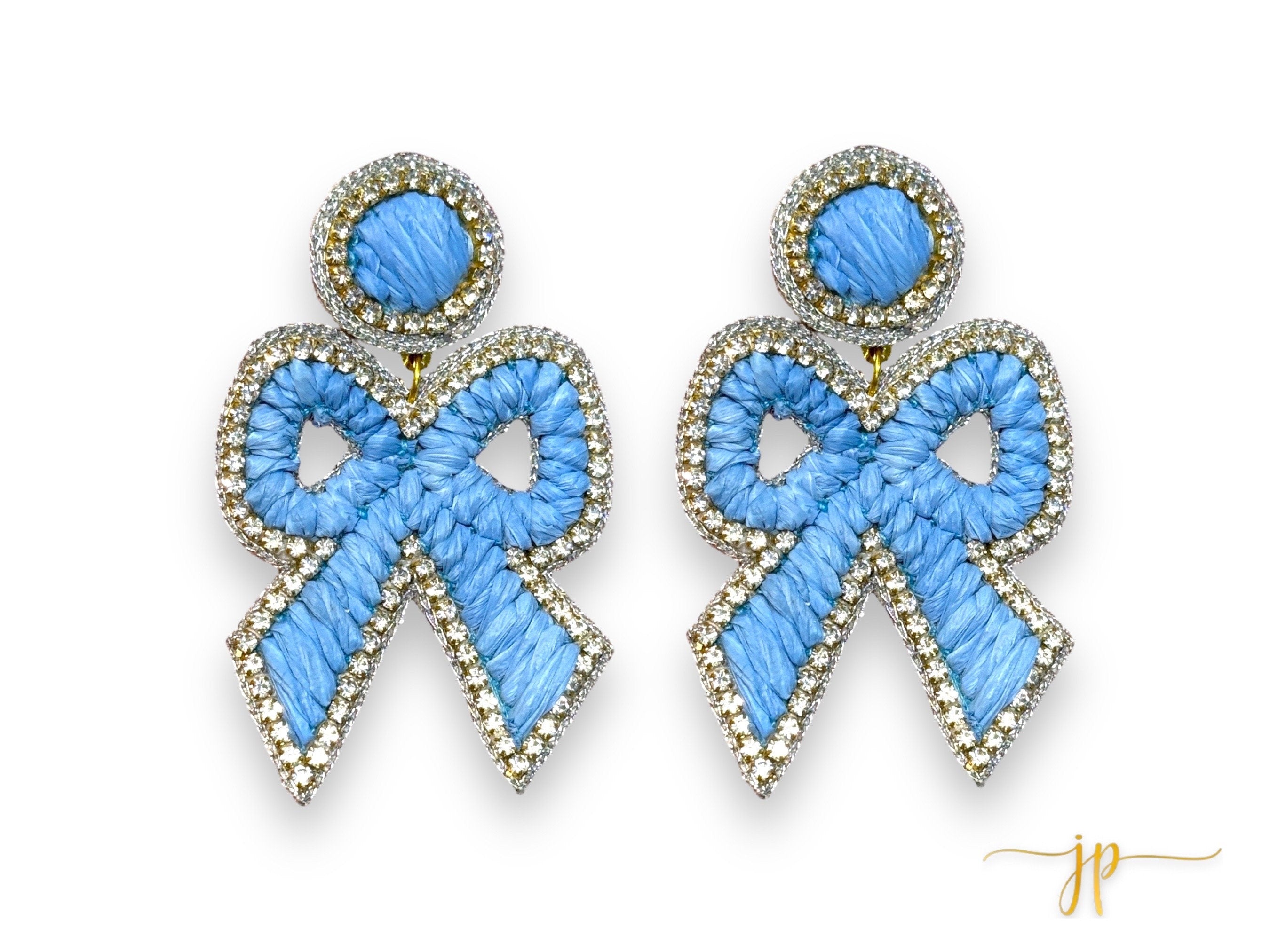 These Light Blue Coquette Rhinestone Bow handmade earrings are part of our New Royal Romance Collection. Inspired by the timeless beauty of the Regency Era aesthetic. These earrings will add a touch of whimsy and romance to any outfit. A collection that is both flirty and charming!