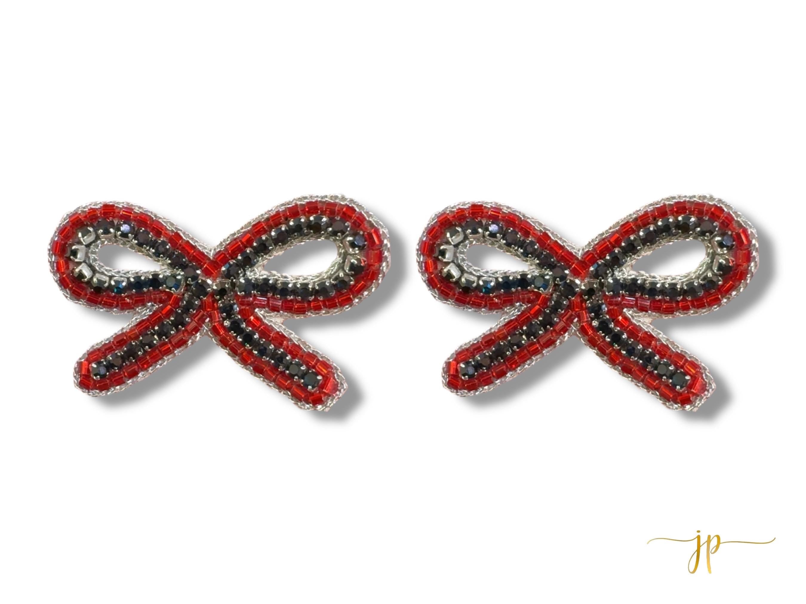 Get ready to sparkle on game day with these stunning Black and Red Rhinestone String Bow Beaded Stud Earrings! Perfect for showing off your team spirit!