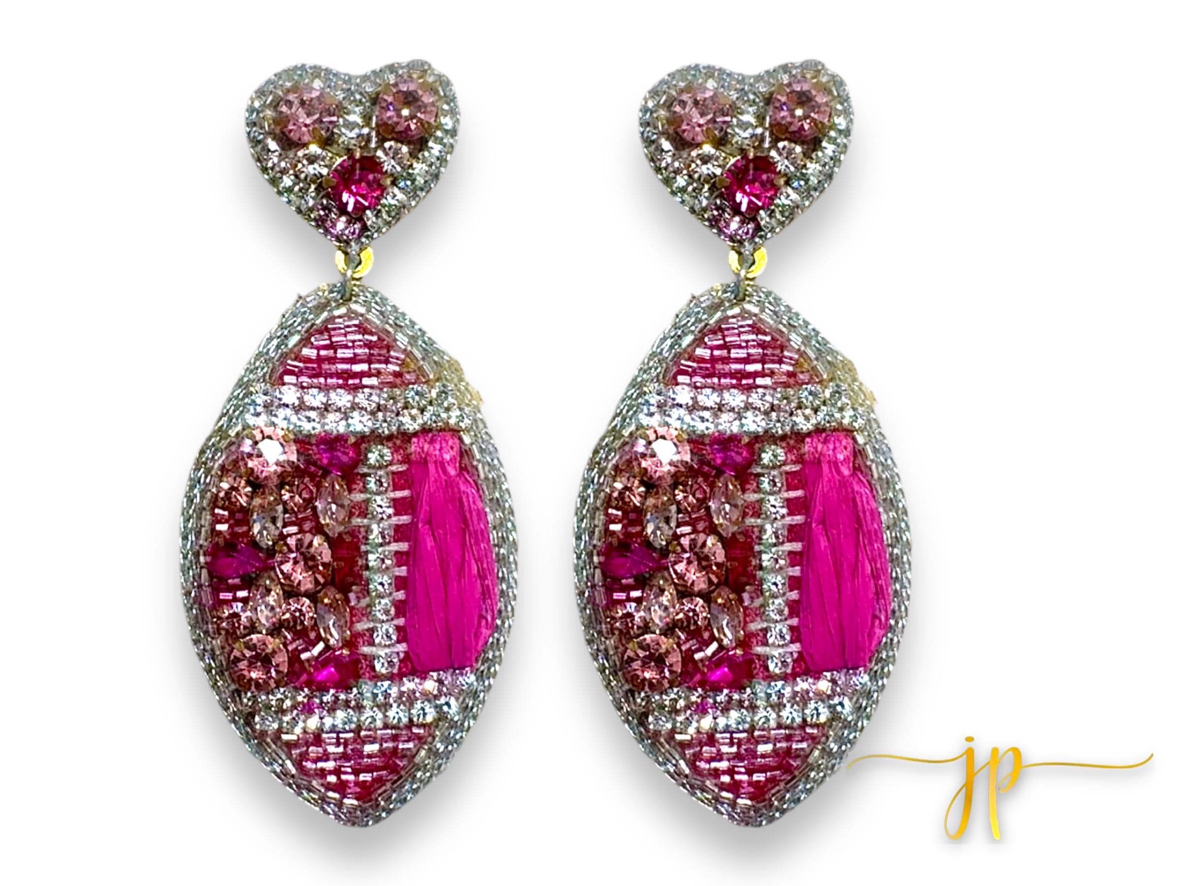 Get ready to sparkle on game day with these stunning Dark Pink Rhinestone Hearts Raffia Football Earrings! Perfect for showing off your team spirit with a touch of glamour, these earrings feature: