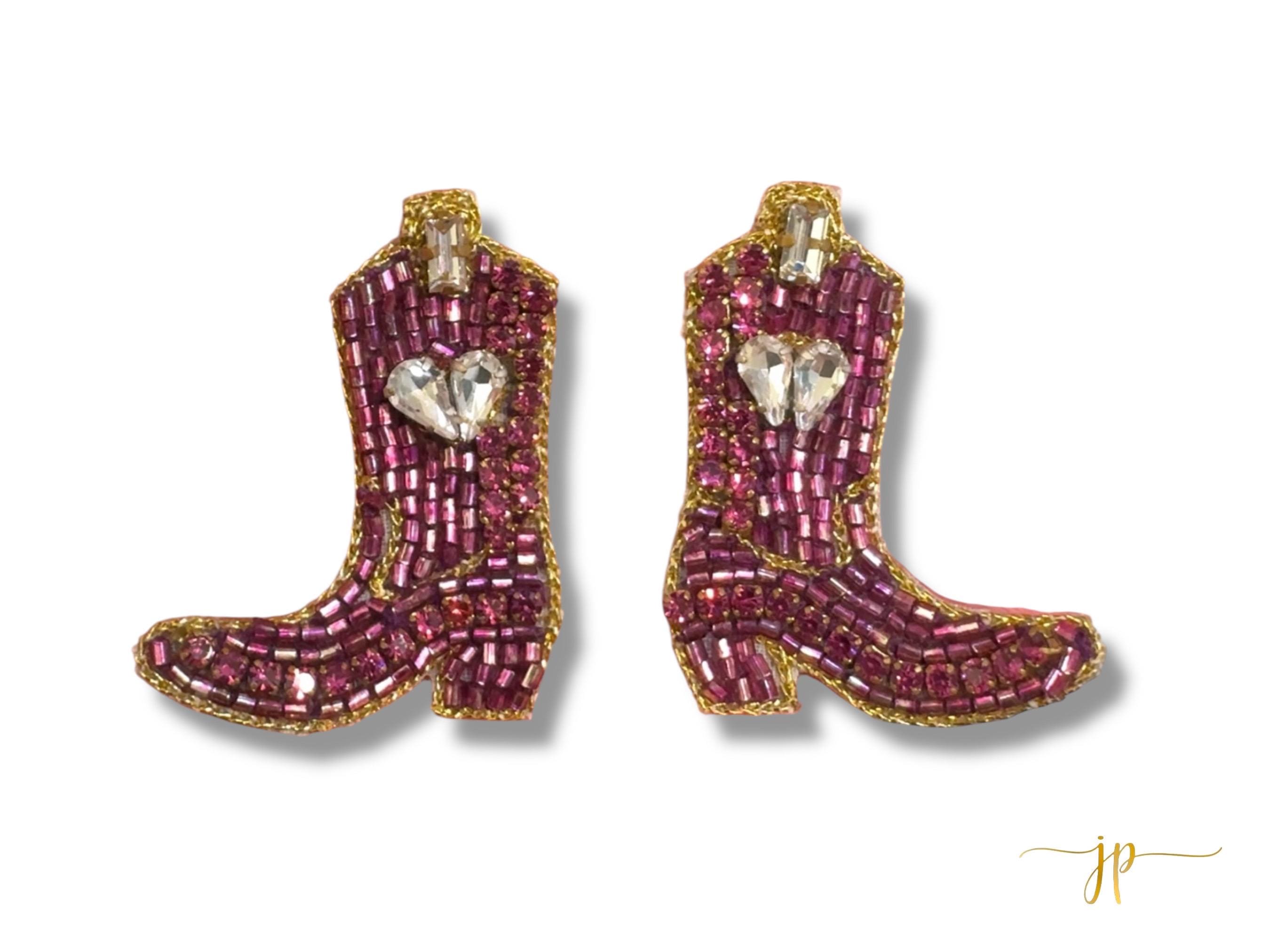 Get ready to sparkle on Game Day with our stunning Beaded Rhinestone Boot Stud Earrings with Hearts in purple and Gold. Perfect for showing off your team spirit with a touch of glamour!
