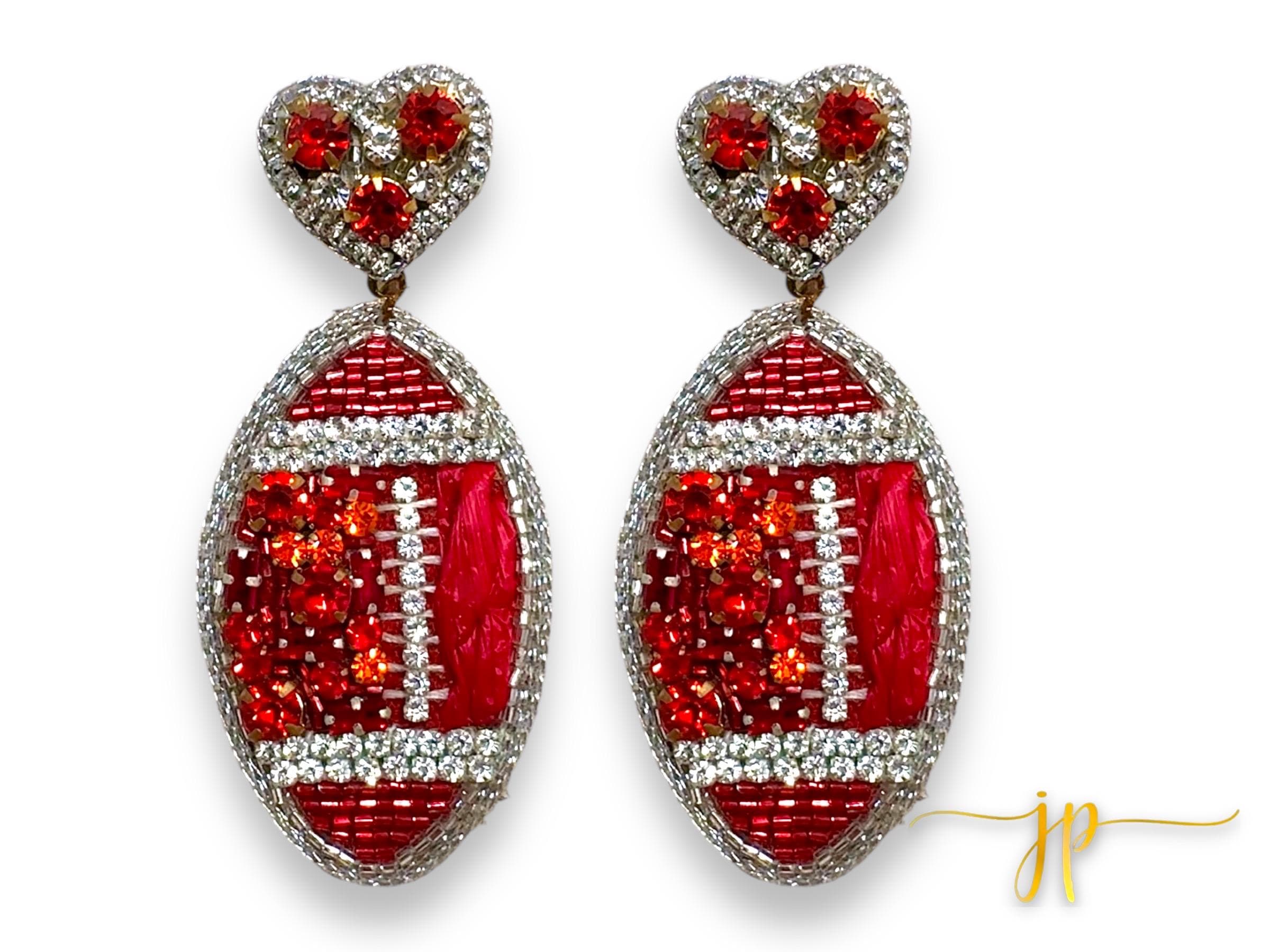 Get ready to sparkle on game day with these stunning Red Rhinestone Hearts Raffia Football Earrings! Perfect for showing off your team spirit with a touch of glamour, these earrings feature: