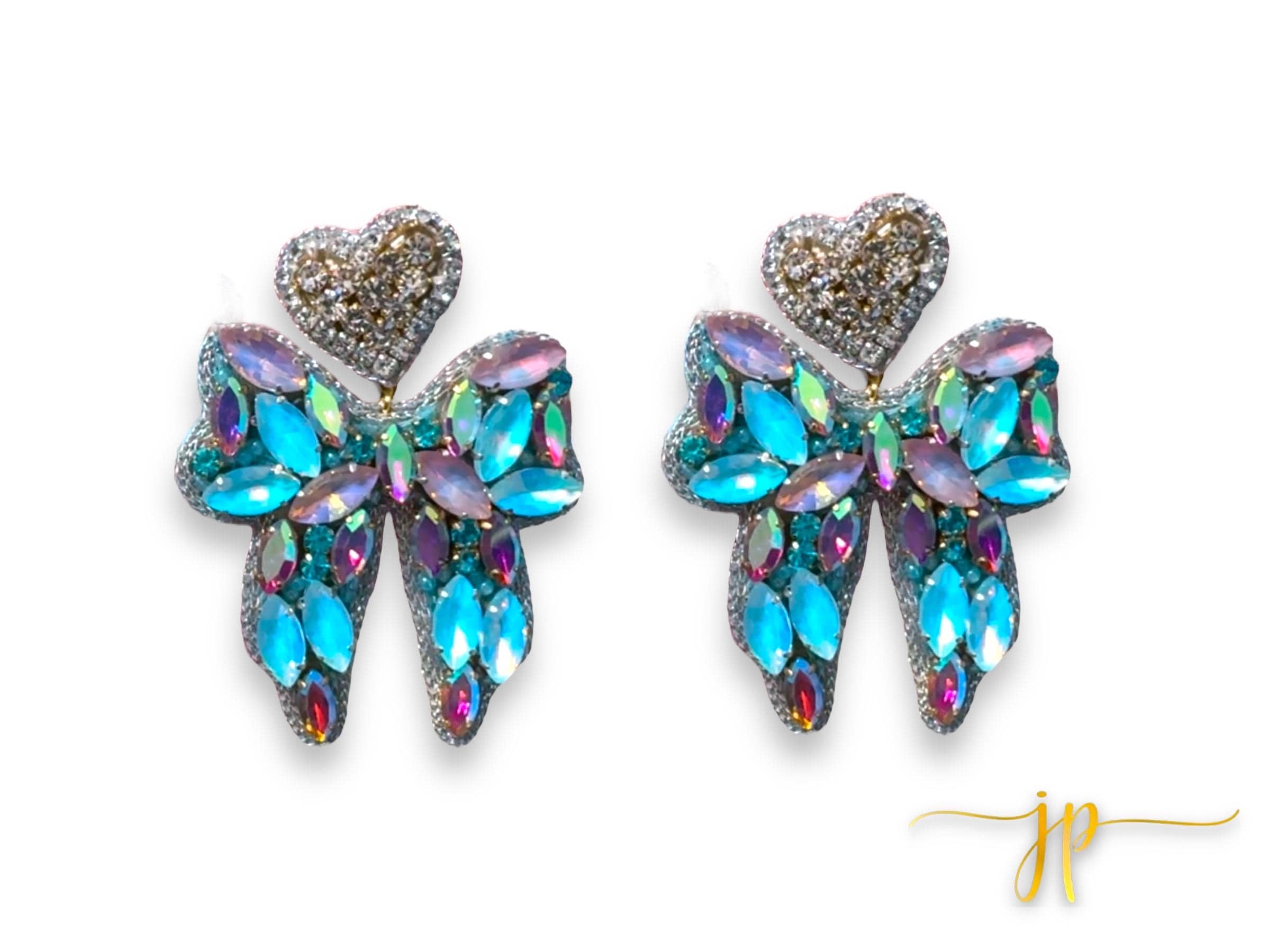 These earrings are part of our Frosted Nutcracker Christmas Earring Collection. Featuring a coquette bow design in iridescent high quality shimmering rhinestones that catch the light beautifully and capture the whimsical charm of the holiday season. The earrings feature our dazzling heart-shaped rhinestone topper.