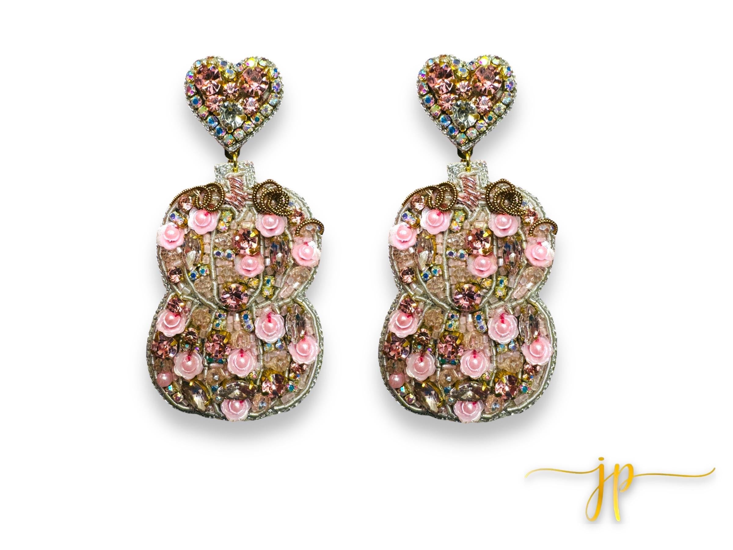 These charming stacked pumpkin earrings feature delicate pink roses and sparkling rhinestones, set in a romantic, coquette inspired design. Topped with a rhinestone heart stud, they’re perfect for adding elegance to your fall wardrobe or any special occasion.