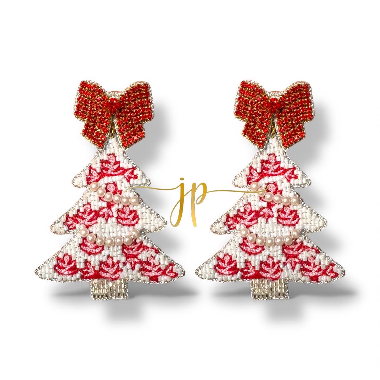 Our stunning hand-beaded coquette Christmas Tree earrings, embody a romantic and whimsical aesthetic featuring an intricate porcelain red pink rose toile pattern and a sparkling red rhinestone bow accent. Each piece is crafted with high-quality beads and rhinestones, creating a charming statement accessory for Christmas. These are released as part of our Sugar Plum Velvet Holiday Collection.