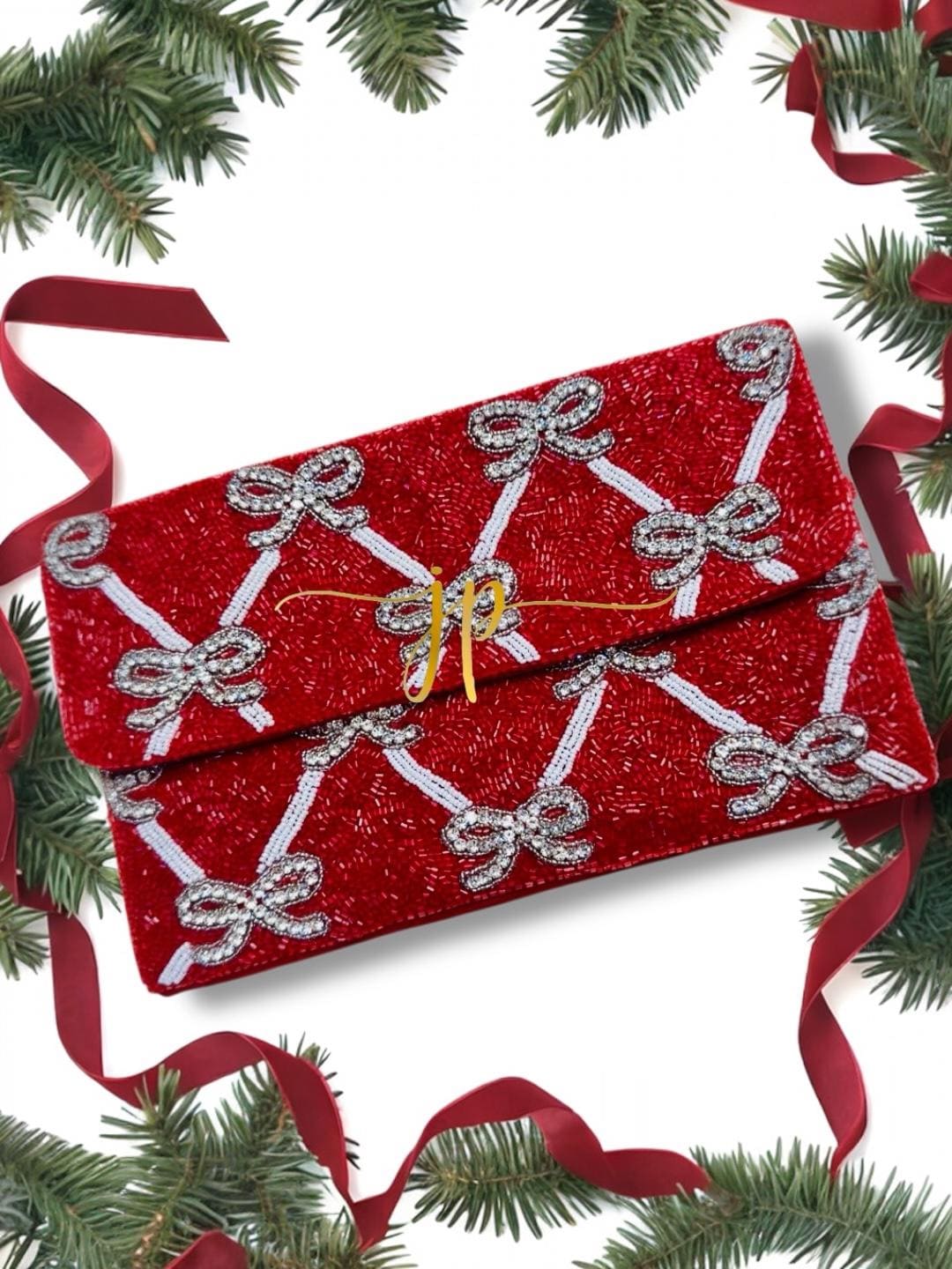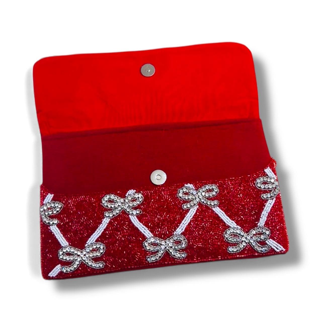 Hand-beaded by master artisans in Jaipur, using premium glass seed beads and high-clarity rhinestones.This Red Coquette Beaded Bow Rhinestone Clutch is handmade and features a detachable silver chain so it can also be worn as a crossbody. It pairs perfectly with our earrings from Holiday and Valentines Collections.