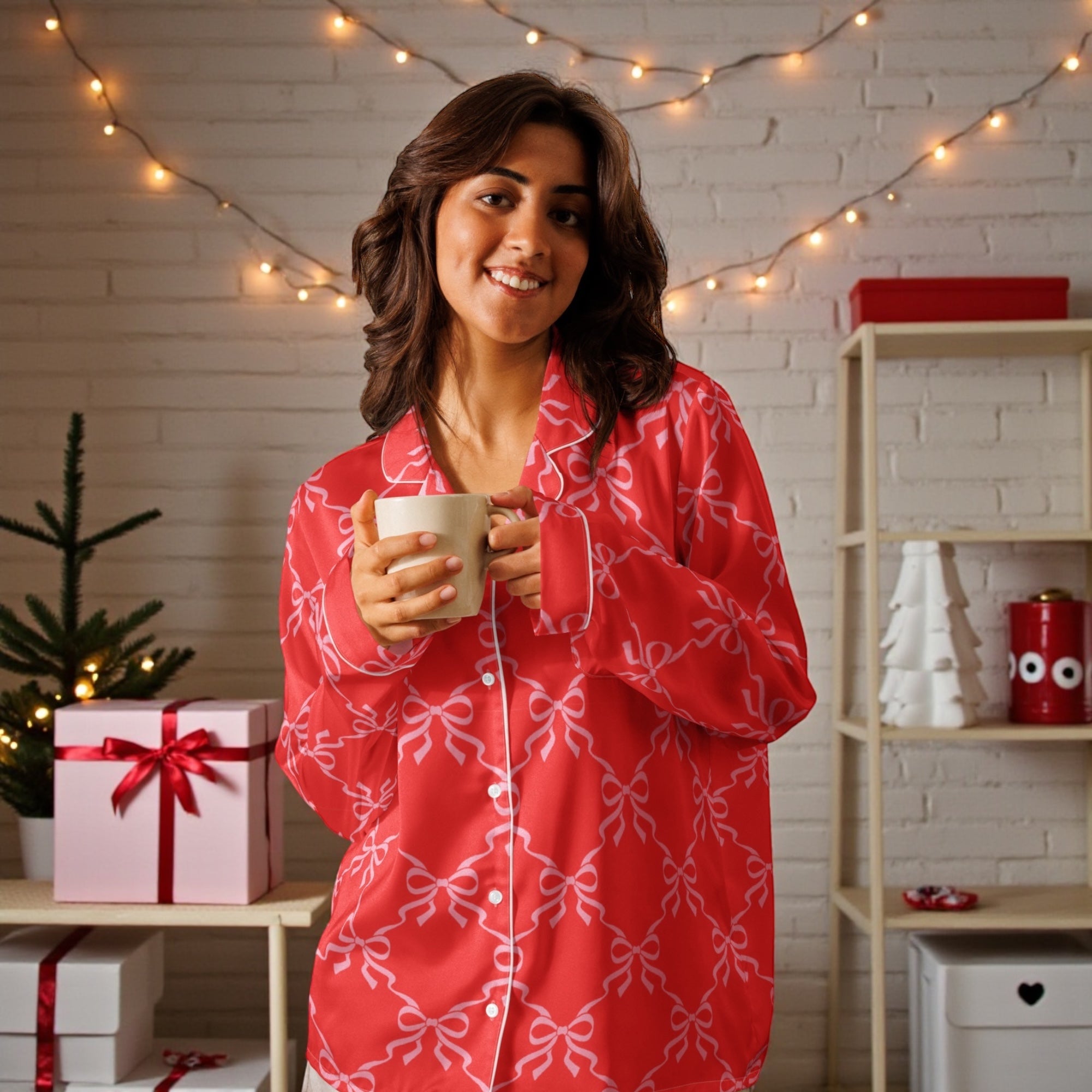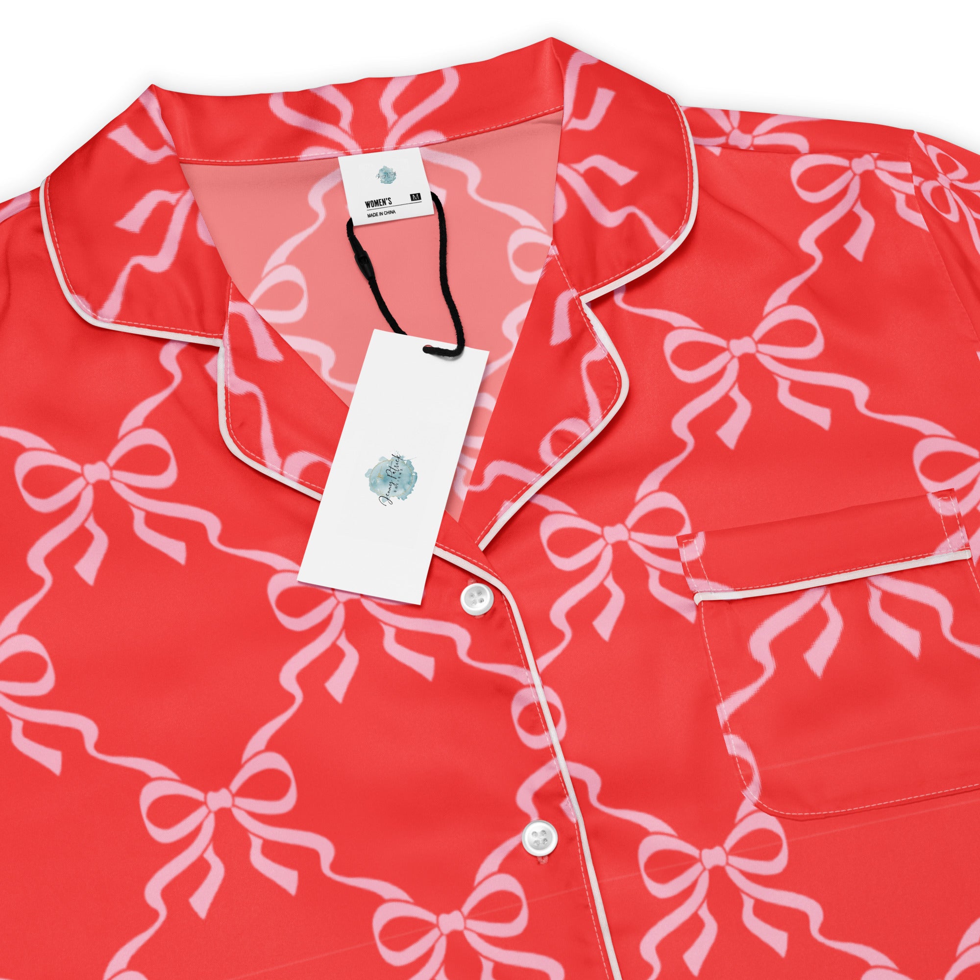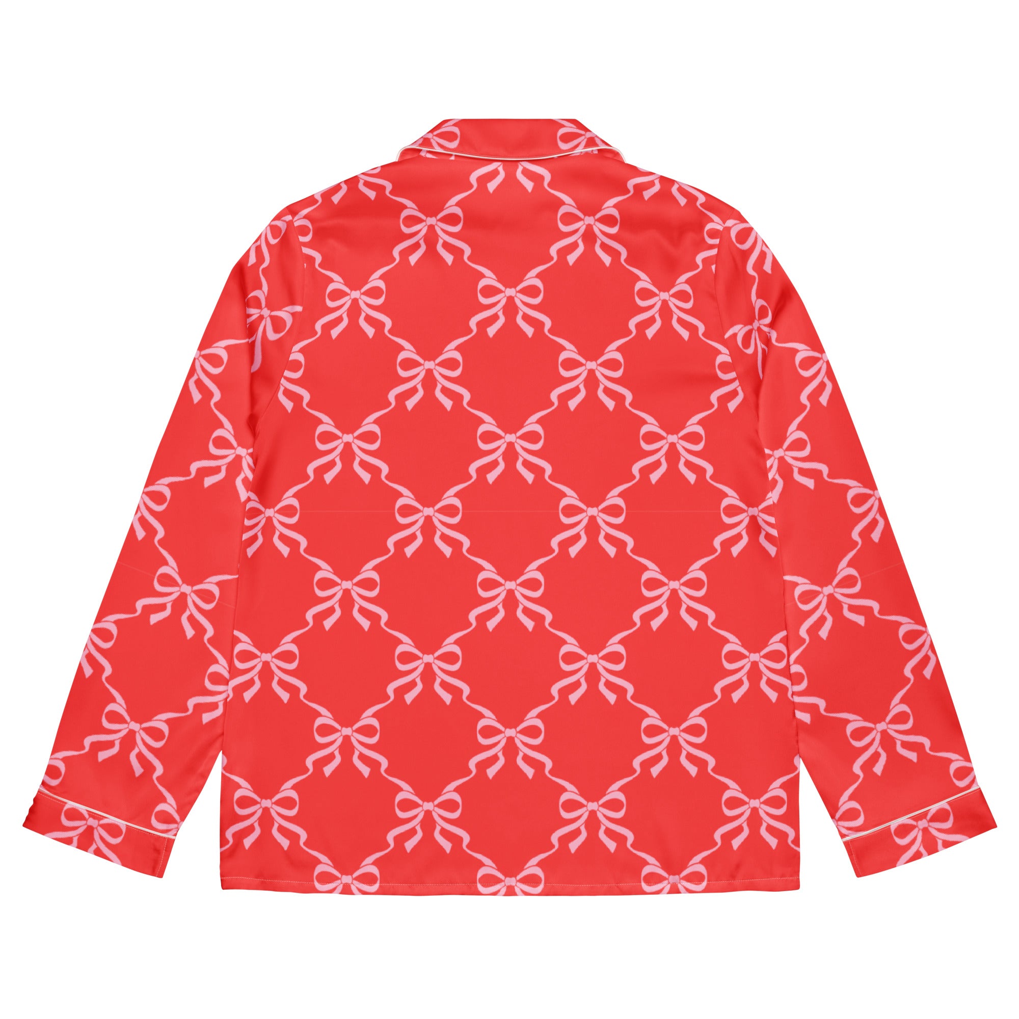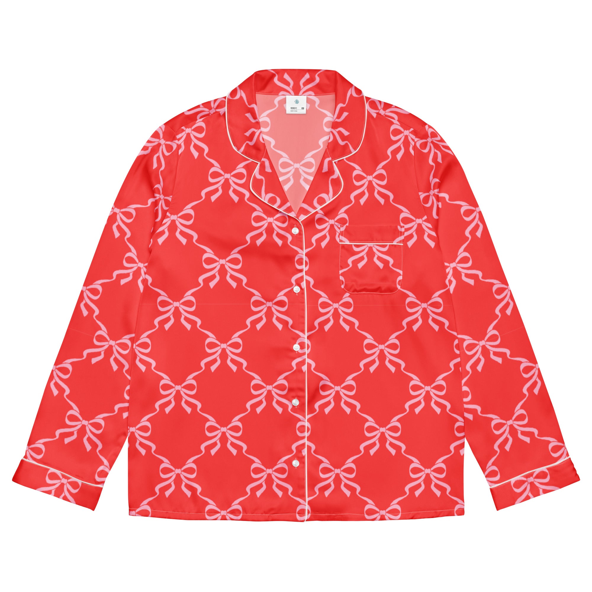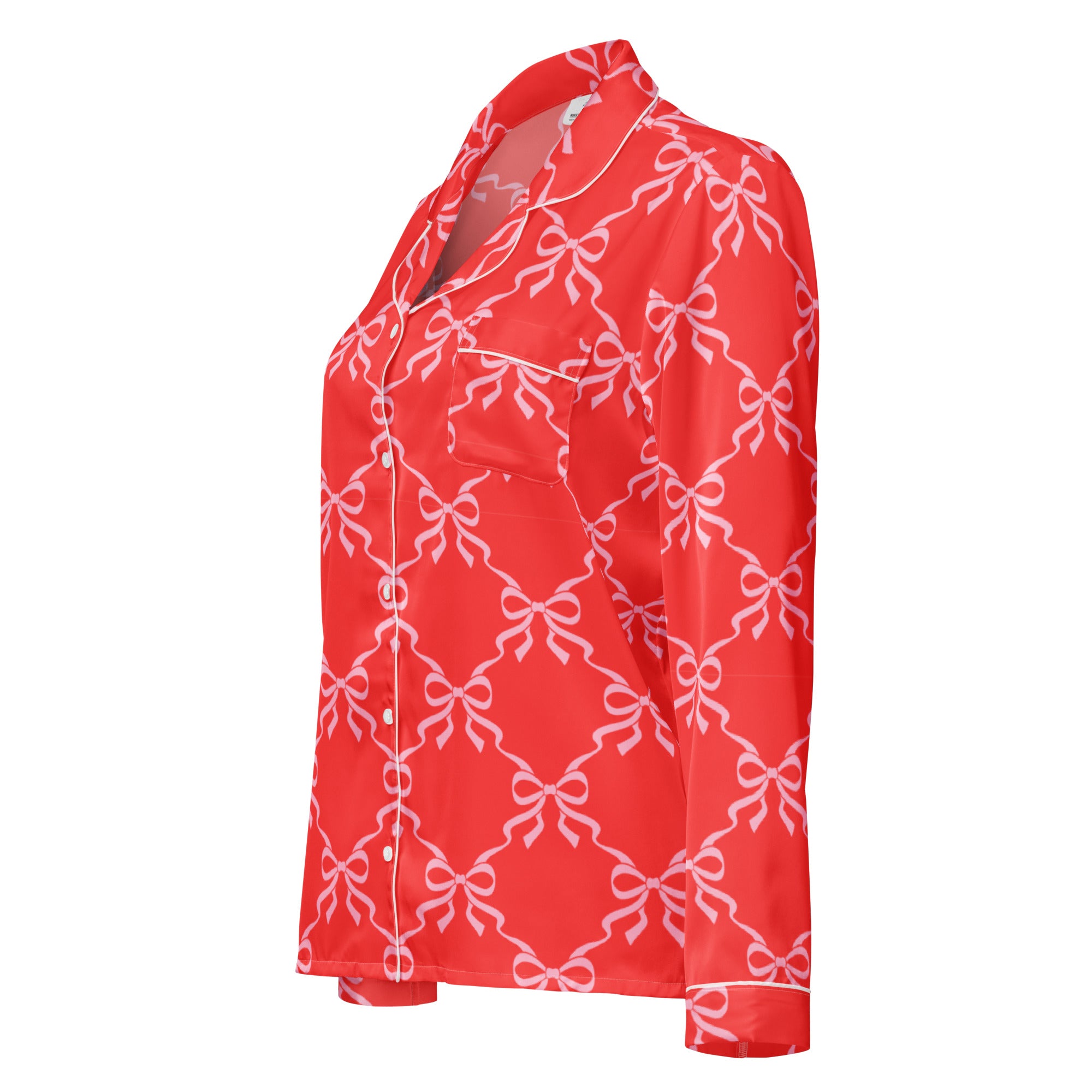 Red with Pink Bow Lattice Women’s Long Sleeve Silky Pajama Top