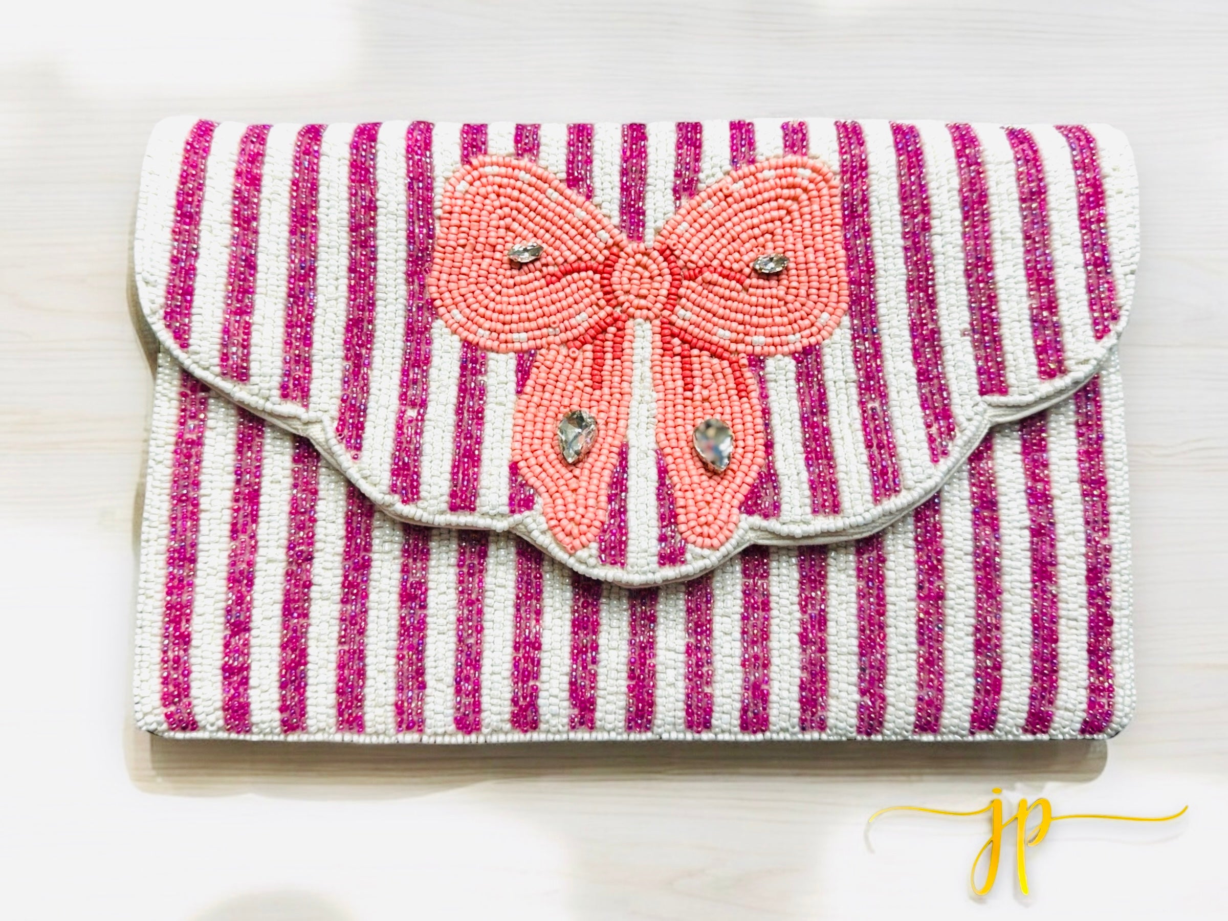 This Pink Striped Coquette Bow Beaded Rhinestone Clutch is handmade and features a detachable chain so it can also be worn as a crossbody. It pairs perfectly with our earrings from Royal Romance Collection. It is also the perfect pink holiday evening bag and can be paired with our earrings from our Frosted Nutcracker Collection.